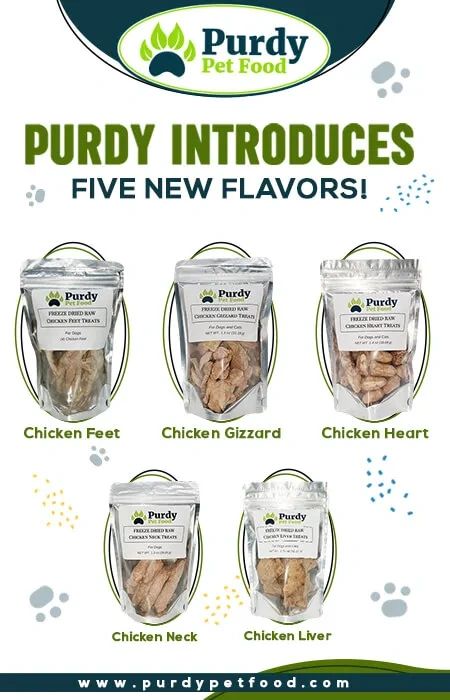 Purdy Pet Food Freeze-Dried Raw Treats for dogs are made from a fresh, single ingredient like chicken neck, beef liver and pork.